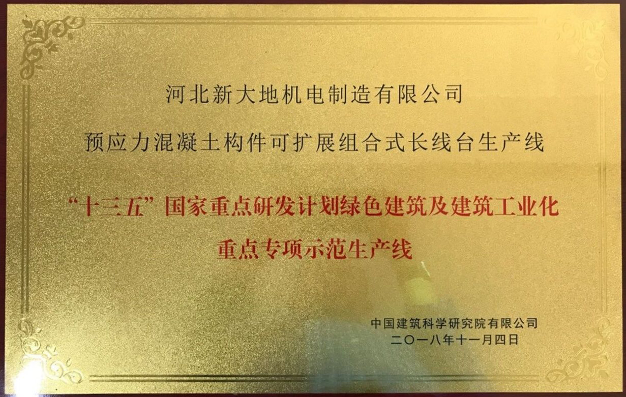精誠(chéng)所至,金石為開。河北新大地先后通過(guò)了ISO9001質(zhì)量管理體系、河北省高新技術(shù)企業(yè)、河北省企業(yè)技術(shù)中心的認(rèn)證,被評(píng)為“科技部創(chuàng)新基金立項(xiàng)支持企業(yè)”、“國(guó)家發(fā)改委重點(diǎn)產(chǎn)業(yè)支持項(xiàng)目企業(yè)”、“中國(guó)國(guó)際住宅產(chǎn)業(yè)博覽會(huì)重點(diǎn)推廣技術(shù)”、“國(guó)家住宅產(chǎn)業(yè)化基地”、“國(guó)家裝配式建筑產(chǎn)業(yè)基地”、“國(guó)家裝配式建筑產(chǎn)業(yè)技術(shù)創(chuàng)新聯(lián)盟副理事長(zhǎng)單位”。