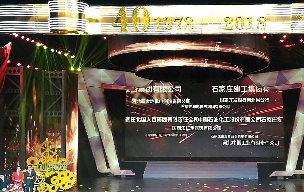 2018年12月21日,在石家莊廣電中心聯(lián)合舉辦了“40年 · 工業(yè)鑄魂”頒獎(jiǎng)盛典。河北新大地機(jī)電制造有限公司榮獲石家莊優(yōu)秀企業(yè)。