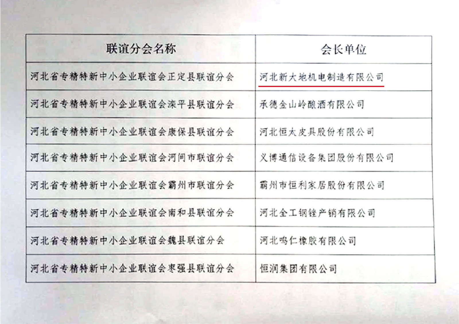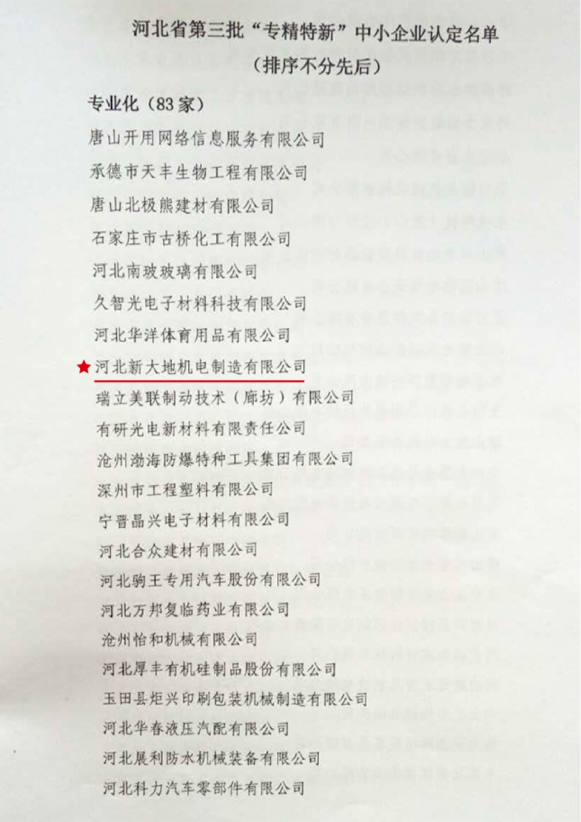 河北新大地機電制造有限公司 通過河北省第三批“專精特新”中小企業(yè)認定