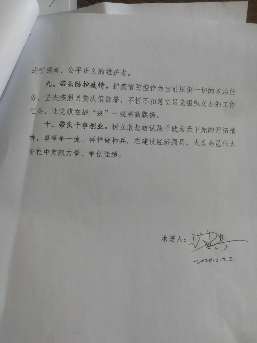 時間:2020-02-23 來源:“我承諾,帶頭做到不搞聚會、減少外出,帶頭宣傳防疫知識、抵制謠言散布,帶頭承擔急難險重任務、聯(lián)系服務職工群眾,在企業(yè)疫情防控和復工復產中踐行好黨員的初心使命?!?/p>